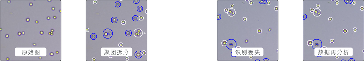 軟件可自動(dòng)拆分聚團(tuán)細(xì)胞,提高細(xì)胞計(jì)數(shù)準(zhǔn)確性;對(duì)識(shí)別出現(xiàn)丟失的數(shù)據(jù),可自定義軟件識(shí)別參數(shù),對(duì)計(jì)數(shù)結(jié)果進(jìn)行再識(shí)別分析(案例細(xì)胞圖為酒酵母)。