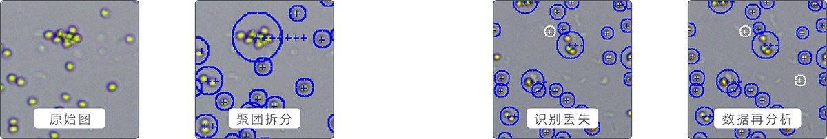 軟件算法可對(duì)采集的細(xì)胞圖像中的聚團(tuán)細(xì)胞進(jìn)行智能化的自動(dòng)拆分,提高細(xì)胞計(jì)數(shù)的準(zhǔn)確性;當(dāng)結(jié)果的細(xì)胞圖像出現(xiàn)部分細(xì)胞識(shí)別丟失時(shí),可自定義軟件識(shí)別參數(shù),對(duì)計(jì)數(shù)結(jié)果進(jìn)行再識(shí)別分析(案例細(xì)胞圖為小球藻)。