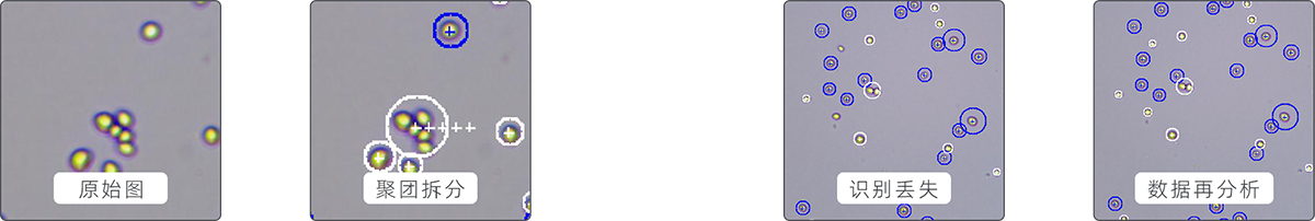 軟件可自動(dòng)識別細(xì)胞聚團(tuán)現(xiàn)象,確保細(xì)胞計(jì)數(shù)的準(zhǔn)確性;對識別出現(xiàn)丟失的數(shù)據(jù),可自定義軟件識別參數(shù),對計(jì)數(shù)結(jié)果進(jìn)行再識別分析(案例細(xì)胞圖為酒酵母)。