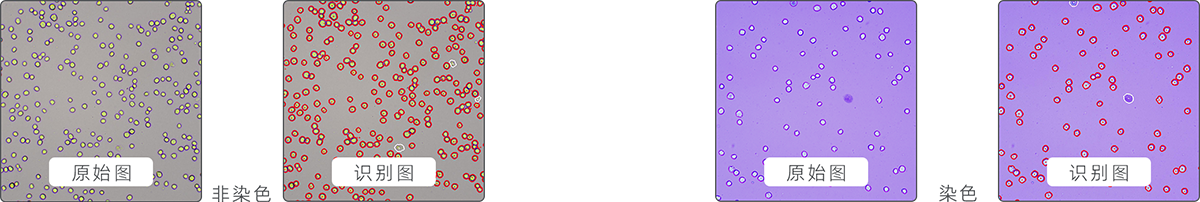 非染色計(jì)數(shù)(發(fā)明專利號:ZL 201310101403.0):無需染色,直接對細(xì)胞進(jìn)行計(jì)數(shù)和區(qū)分活死細(xì)胞,適用于狀態(tài)良好、背景干凈的培養(yǎng)細(xì)胞;臺盼藍(lán)染色計(jì)數(shù):區(qū)分活細(xì)胞和死細(xì)胞的經(jīng)典方法,相比非染色法,色彩變化更直觀。
