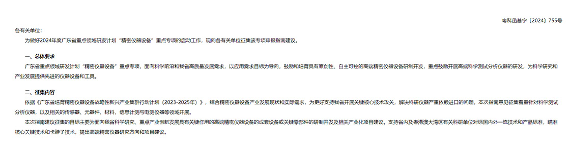 今年6月,廣東省科學(xué)技術(shù)廳發(fā)布關(guān)于征集2024年度廣東省重點領(lǐng)域研發(fā)計劃“精密儀器設(shè)備”重點專項項目指南建議的通知,旨在重點鼓勵開展高端科學(xué)測試分析儀器的研發(fā),為科學(xué)研究和產(chǎn)業(yè)發(fā)展提供先進的儀器設(shè)備和工具。